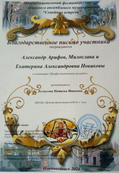 2 марта семейный ансамбль Новиковых-Арифовых, состоящий из 3 человек: мама – Новикова Екатерина Александровна – концертмейстер Детская школа искусств № 6, сын – Арифов Александр – учащийся 1 класса Музыкального отделения Детской школы искусств № 6 (преподаватель Наталья Ивановна Белоусова) и дочка – Милослава Новикова приняли участие в Межмуниципальном фестивале – конкурсе семейного ансамблевого музицирования “Семейные встречи”.