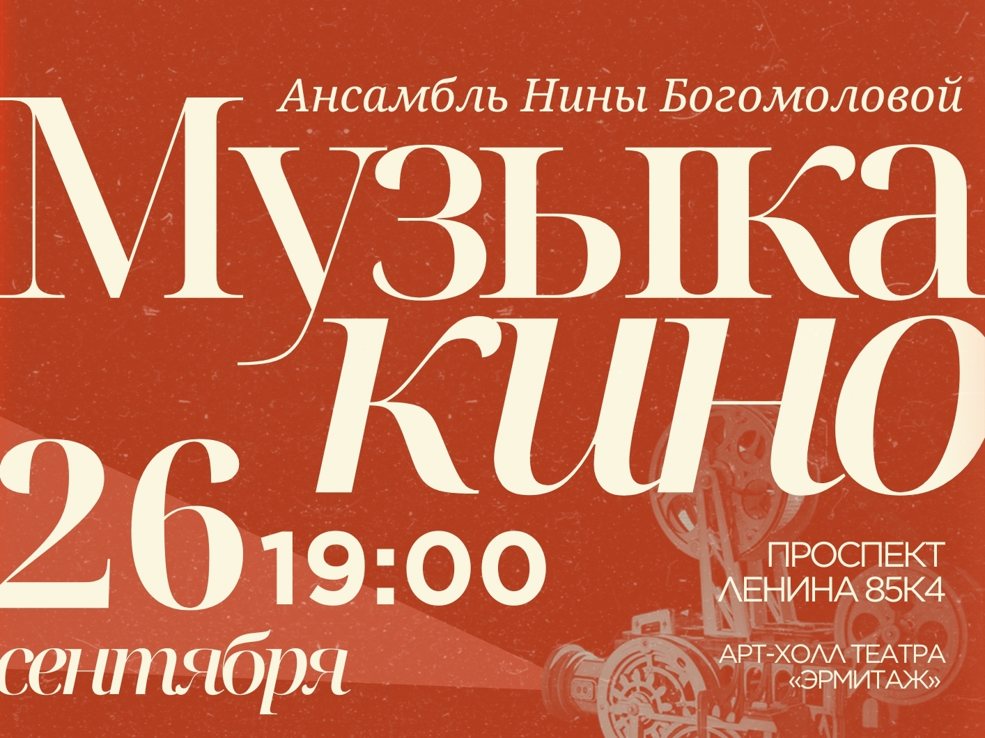 В российских и советских фильмах было много отличных песен и красивых мелодий, что ансамбль Нины Богомоловой решил дополнить свою программу “Музыка кино”! Композиции из фильмов “12 стульев”, “Любовь и голуби”, “Большая перемена”, “Служебный роман”, “Приключения Шурика”, “Иван Васильевич меняет профессию”, “Гардемарины, вперёд!”, “Ирония судьбы”, “Путь к причалу”, “За последней чертой”,…