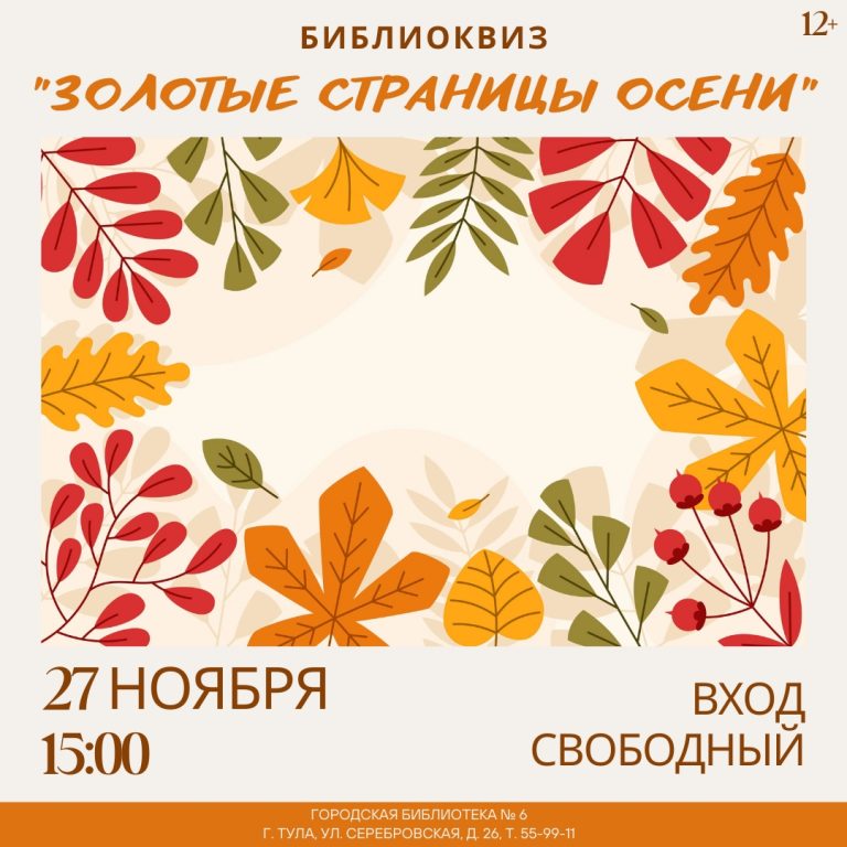 Друзья, осень — это не только про дождь за окном, но и про уютные вечера и тёплые встречи! Ждём всех любителей головоломок и хорошей компании 27 ноября в Городской библиотеке №6. Вас ждёт: 25 увлекательных вопросов на эрудицию и логику. Каждый вопрос — маленькая осенняя история. Ведущая — Ольга Вострикова,…