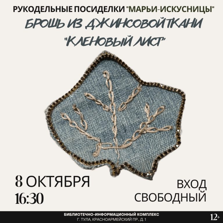 Осень — время вдохновения и уютного творчества! Приглашаем вас на встречу с дизайнером и мастером декоративно-прикладного искусства Светланой Барабановой. Вас ждёт увлекательный мастер-класс, где вы создадите стильный аксессуар ручной работы — текстильную брошь из джинсовой ткани “Кленовый лист”. Этот символ осени, красоты и свободы станет изюминкой вашего образа. Что вас…