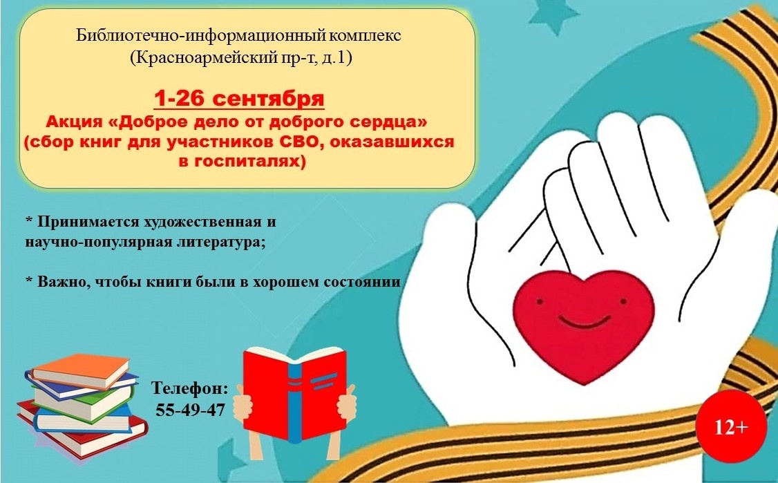 Объявляется сбор книг для госпиталей, в которых проходят реабилитацию и лечение бойцы СВО. Мы ждем всех, кто готов поддержать наших бойцов. Принимаются любые книги, которые укрепят дух или заставят улыбнуться, а главное – помогут бойцам восстановиться, скрасив долгие дни лечения и реабилитации. Книги принимаются по адресу Красноармейский пр-т, дом 1…