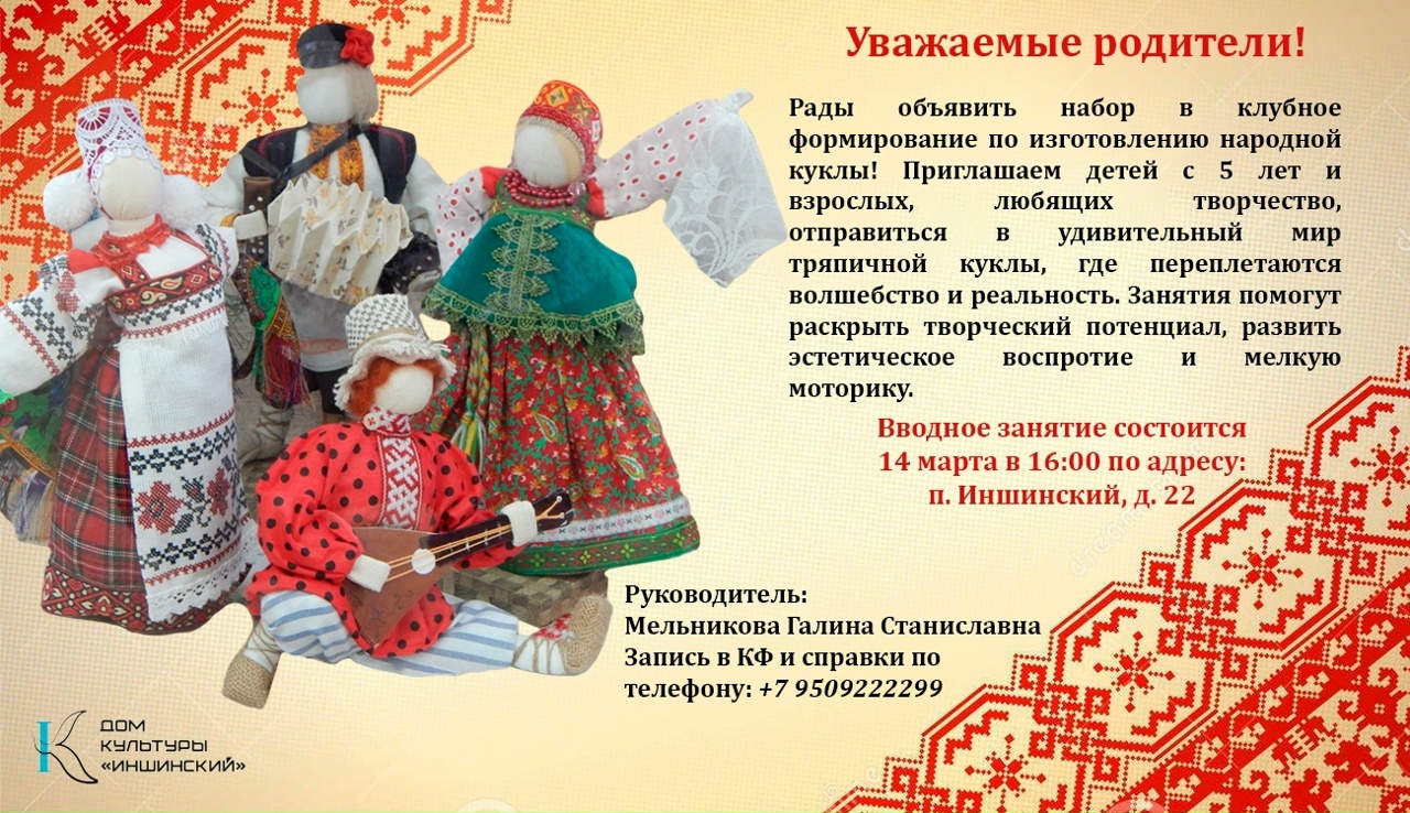 Дорогие друзья! Дом Культуры “Иншинский” приглашает вас стать частью уникального творческого сообщества, где вы сможете освоить искусство создания традиционных народных кукол и погрузиться в богатейшую культуру наших предков. Станьте частью нашего дружного коллектива!