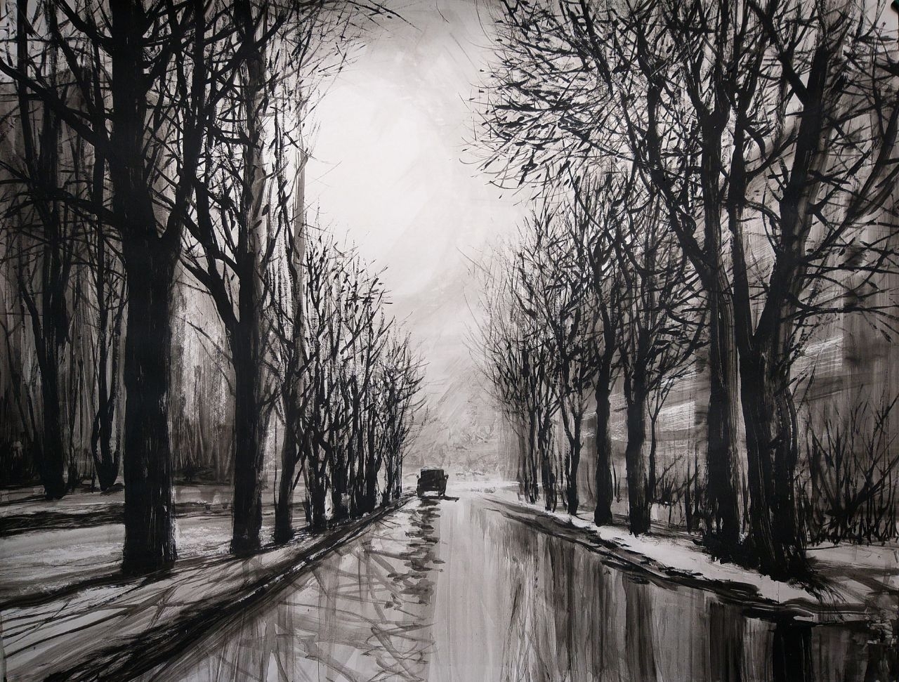 Работа: “Побег. Тула, ул. Н. Руднева”, 64х83, картон, акрил, частная коллекция, 2022. Художник Армен Аганесов: “Улица Руднева, самая её горловина, ещё чуть-чуть и развязка, беги на все четыре стороны. В Ясную Поляну или Щёкино, Калугу, Москву, да хоть в Рязань. Беги на дачу, беги в лес или поля, беги на…
