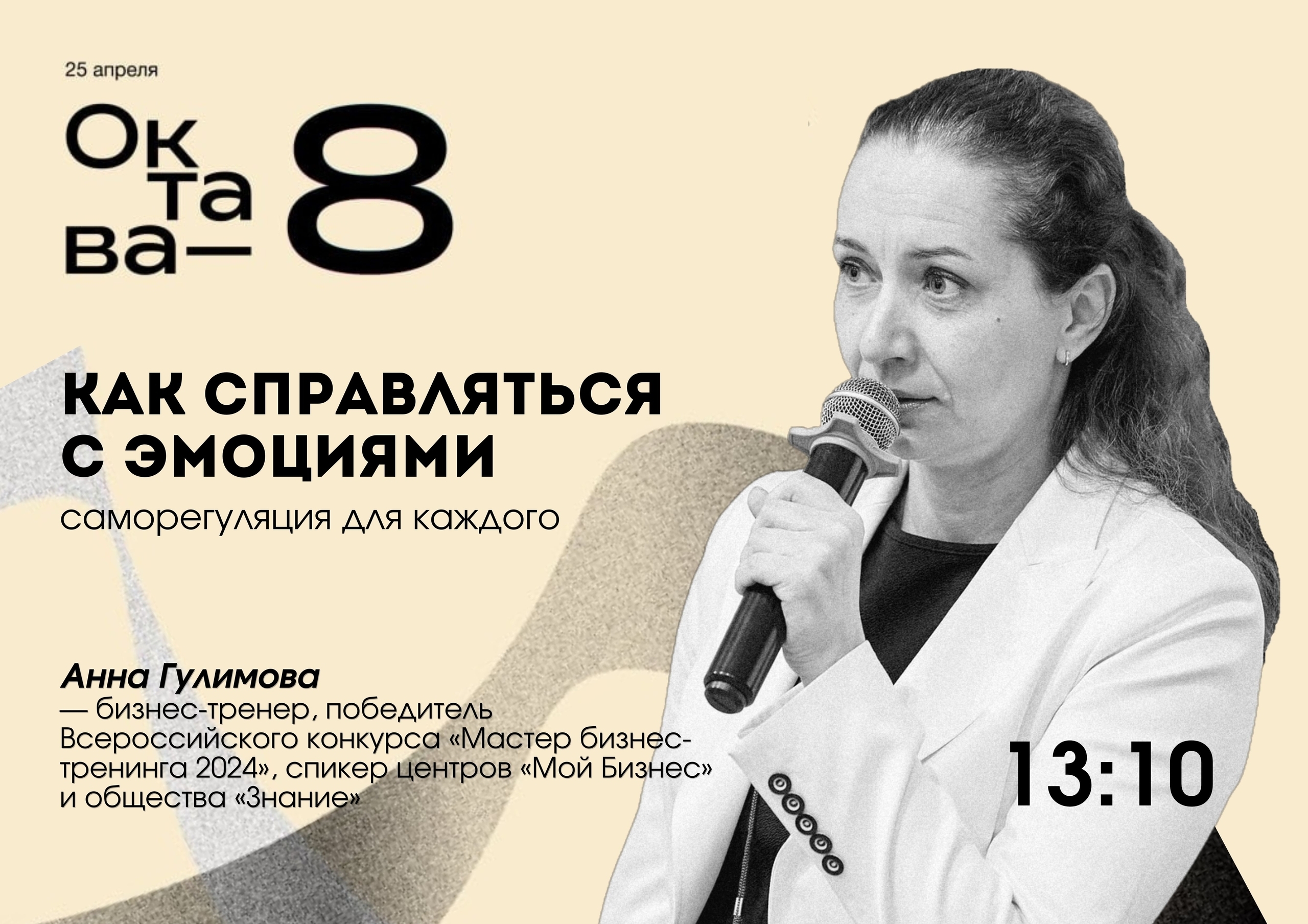 • 13:10 — мастер-класс “Как справляться с эмоциями. Саморегуляция для каждого» бизнес-тренера и игропрактика Анны Гулимовой (vk.com/id4031508)
