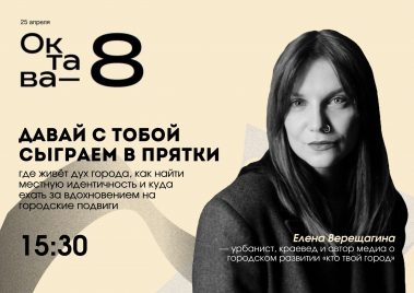 • 15:30 — лекция “Давай с тобой сыграем в прятки” урбаниста и автора медиа «кто твой город» (ktogorod.ru) Елены Верещагиной