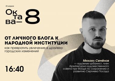 • 16:40 — лекция “От личного блога к народной институции: как превратить увлечение в драйвер городских изменений” Михаила Семёнова (vk.com/id5352885), художника-урбаниста, члена Архитектурно-художественного совета при Фонде по сохранению и развитию Сергиева Посада