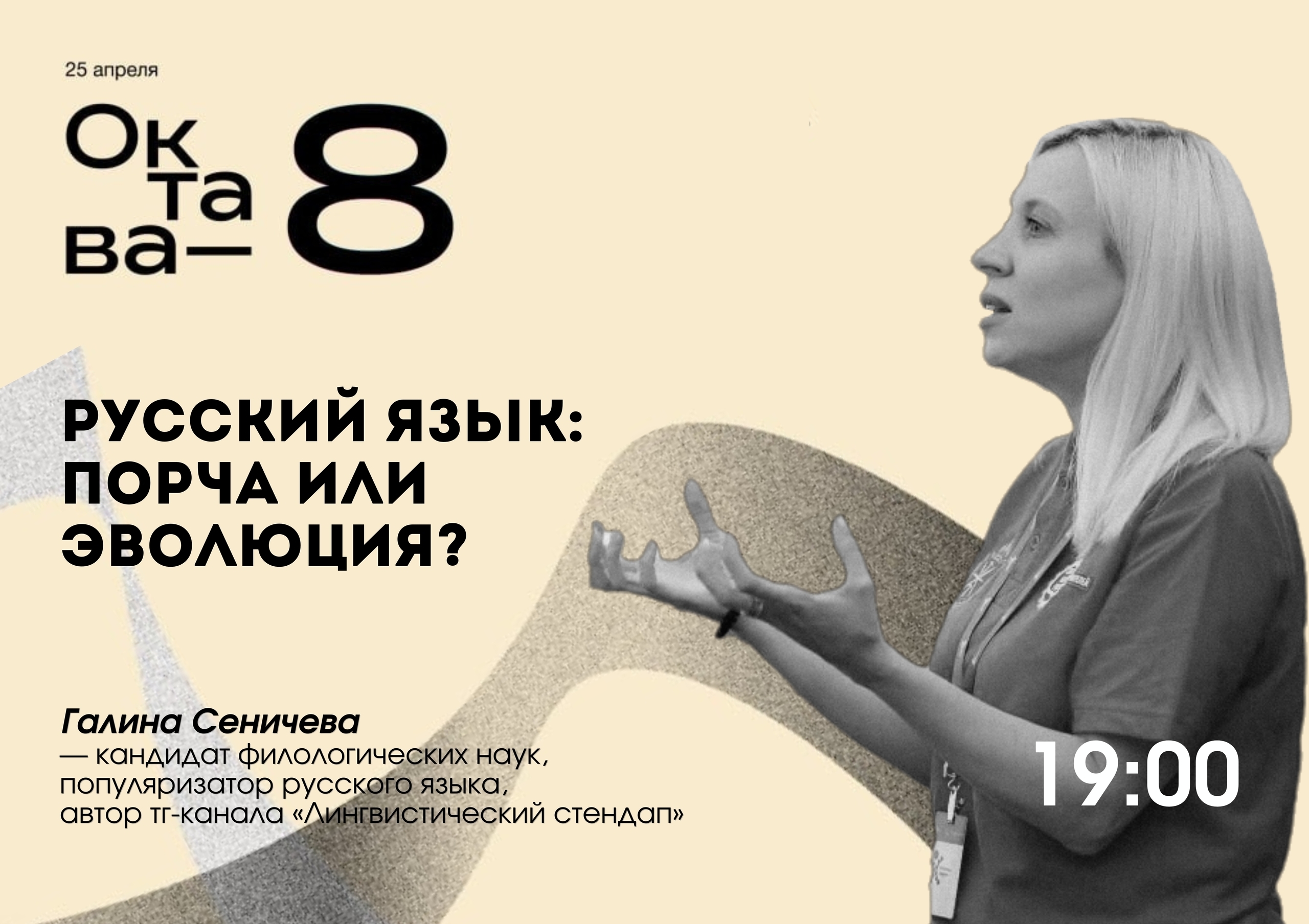 • 19:00 — лекция “Русский язык: порча или эволюция?” Галины Сеничевой (vk.com/id556496095), кандидата филологических наук, популяризатора русского языка и автора тг-канала “Лингвистический стендап”