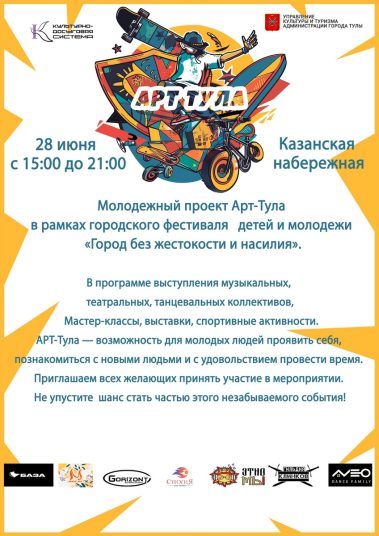 28 июня на Казанской набережной с 15.00 до 21.00 будет проходить молодежный проект «АРТ-Тула» проходит в рамках городского фестиваля детей и молодежи «ГОРОД БЕЗ ЖЕСТКОСТИ И НАСИЛИЯ».