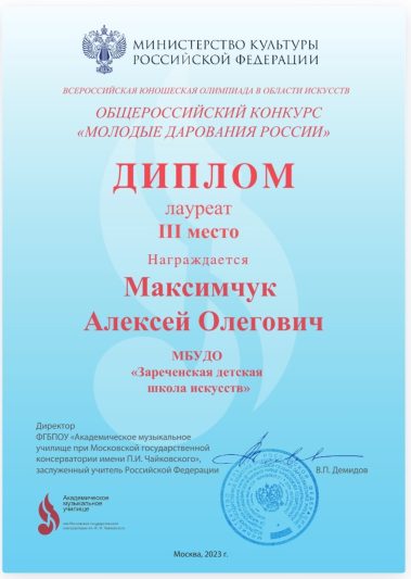 Учредителем конкурса является Министерство культуры Российской Федерации.Ежегодный конкурс Министерства культуры Российской Федерации, направлен на сохранение и развитие системы художественного образования в Российской Федерации и поддержку учащихся детских школ искусств. Конкурс проводится с 2006 года. В этом году учащиеся Зареченской детской школы искусств получили звание “Молодые дарования России!”