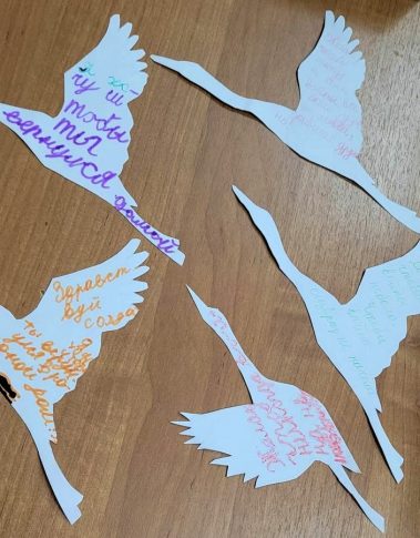 Каждый из детей взял белого журавля и написал на нём своё пожелание мира и добра. Далее мы закрепили их на специальном панно и посетили памятник воинам Великой Отечественной войны в поселке Ленинский-1.