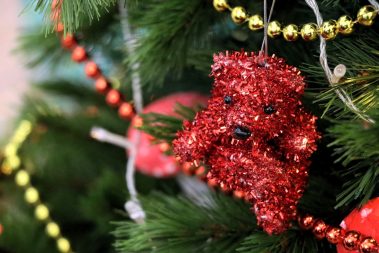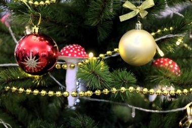 Украшена она празднично, богато: золотые бонбоньерки, яркие мухоморы, игрушки, шарики, гирлянды…