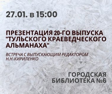 На этой неделе Вас ждет юбилейный творческий вечер заслуженного артиста России Виктора Ананьина, презентация 20-го выпуска “Тульского краеведческого альманаха” от выпускающего редактора Натальи Кириленко, встреча с писателем Егором Козловым, открытие выставки пирографии Светланы Вытягивой, час памяти к 80-летию со дня полного освобождения Ленинграда от фашистской блокады, литературный вечер к 150-летию со дня рождения Моэма.