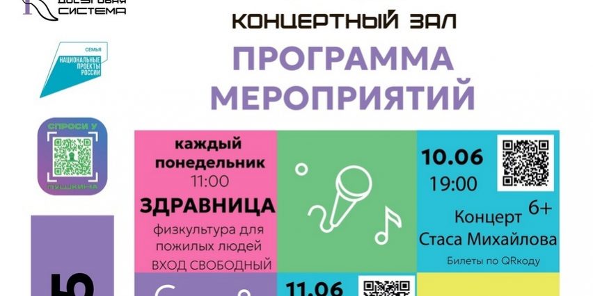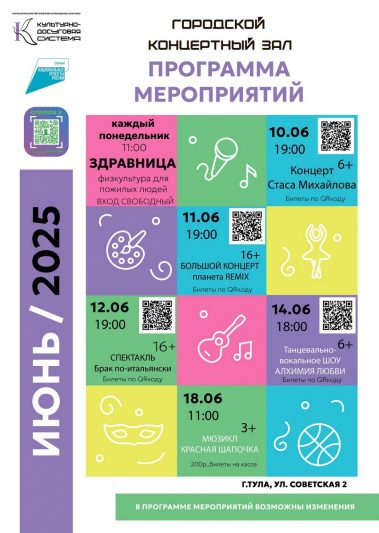 Все мероприятия проходят согласно действующему расписанию, билеты можно приобрести по QR коду на афише или кассы ГКЗ.