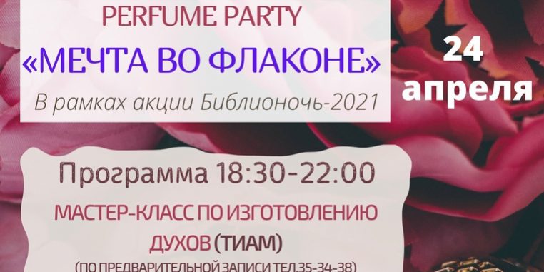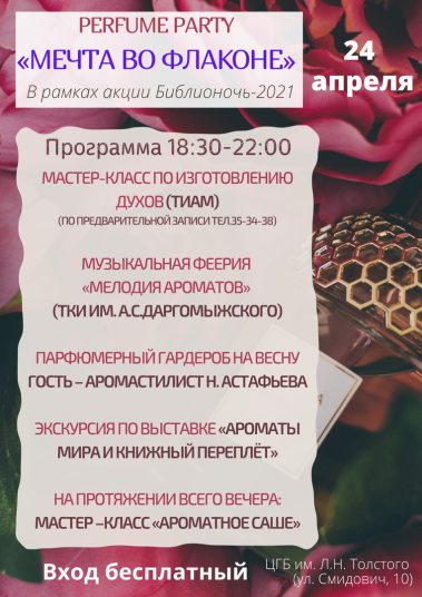 24 апреля 2021 г. с 18.30 – 22.00 в читальном зале Центральной городской библиотеки им. Л.Н.Толстого МУК «Тульская библиотечная система» (ул.Болдина, д.149/10) в рамках акции «Библионочь – 2021» состоится Perfume Party (парфюмерная вечеринка) «Мечта во флаконе».