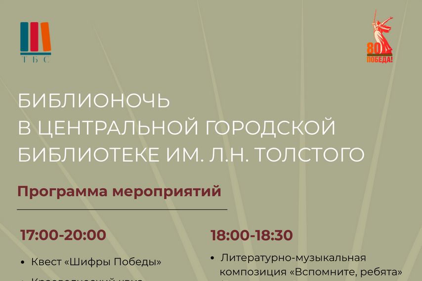 В Центральной городской библиотеке им. Л.Н. Толстого состоится масштабная Всероссийская акция “Библионочь-2025”, посвящённая 80-летию Победы в Великой Отечественной войне. Этот вечер — дань памяти героям, отстоявшим нашу Родину, и возможность почувствовать связь поколений через творчество, знания и живые эмоции. Мы подготовили для вас насыщенную программу, где каждый найдёт что-то по…