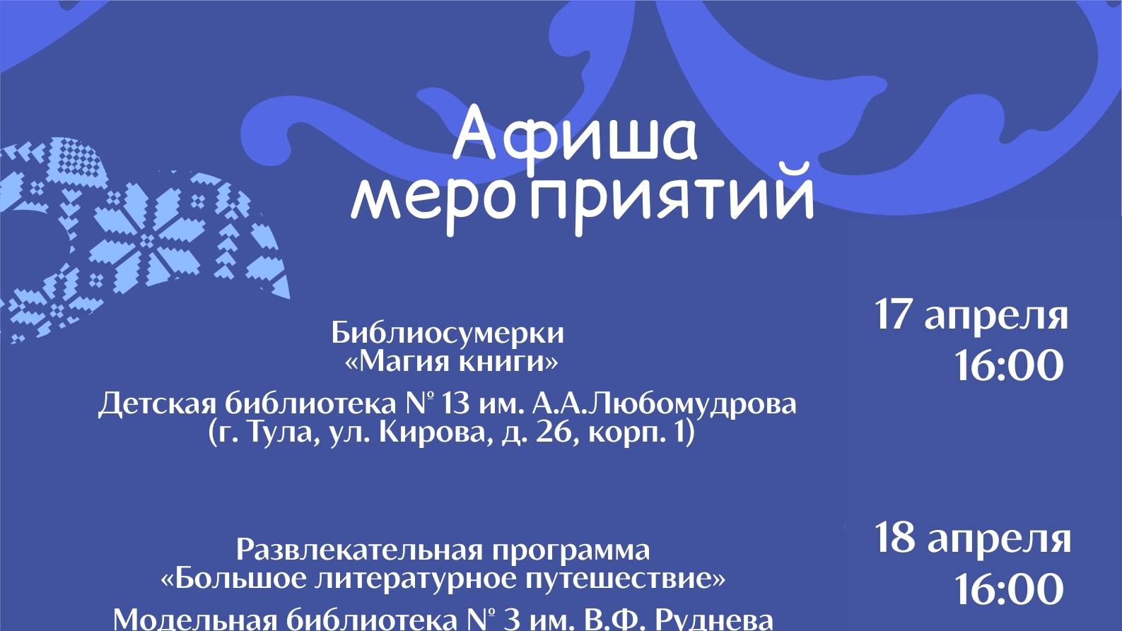 “Библионочь” – это шанс вырваться из будничной рутины, открыть для себя новые книги и жанры, а также провести вечер в тёплой, творческой атмосфере. Вас ждут сюрпризы, встречи с интересными людьми и море вдохновения. Ждём каждого из вас!