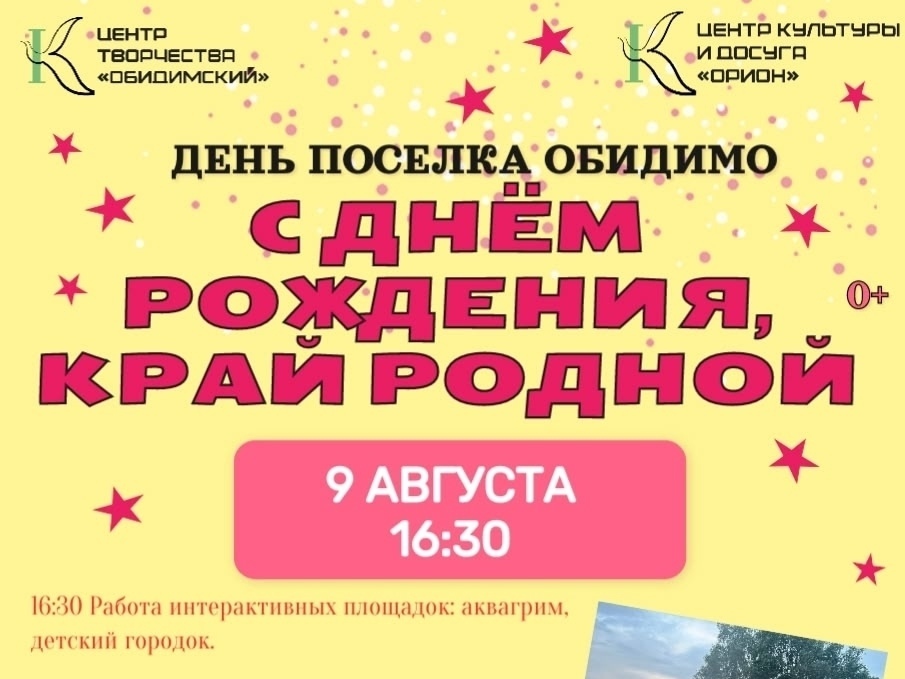 Погрузитесь в атмосферу праздника на Дне посёлка Обидимо! 9 августа с 16:30 ждём Вас на Комсомольской площади для весёлых интерактивных игр и развлечений. В 17:00 — яркий фестиваль красок, а в 18:00 — праздничный концерт с артистами Большой Тулы. Аквагрим, детский городок, розыгрыши призов, сладкая вата, попкорн и фотозона создадут…