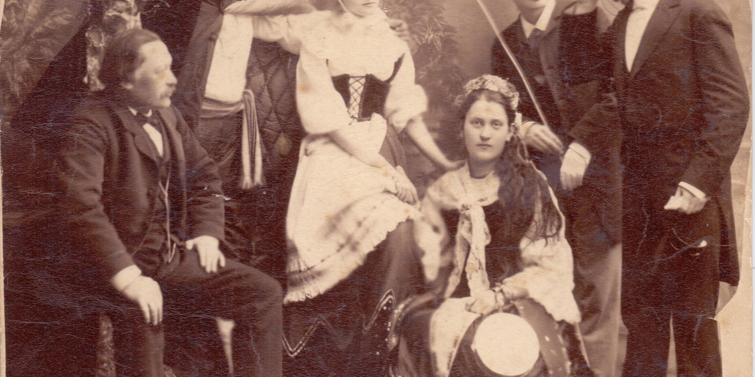 2. “Участники домашнего спектакля”, 7 января 1886 года (на фото: Фердинанд Белявский и его дочь Ольга, Людвиг Вихерт, подруга Ольги Элиза Свейковская, Альфред Свейковский и Рихард Вихерт). Государственный архив Тульской области (ГАТО).