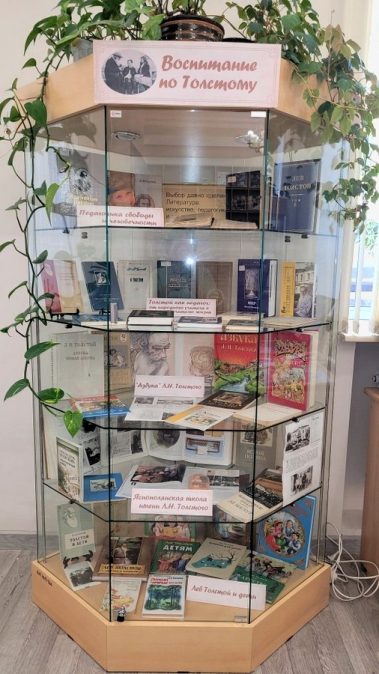 К 195-летию со дня рождения великого писателя Льва Николаевича Толстого (1828-1910) в читальном зале библиотеки оформлена библиотечная выставка “Воспитание по Толстому”.