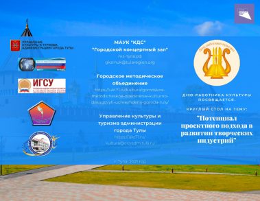 В рамках реализации программных мероприятий национального проекта “Культура” приглашаем учреждения культуры Тульской области присоединиться к реализации программного методического мероприятия “Потенциал проектного подхода в развитии творческих индустрий” в рамках проведения городского проекта “Неделя культуры в городе Туле”, которое состоится 25 марта 2021 года с 9.30 в Городском концертном зале МАУК “Культурно-досуговая система” (г. Тула, ул. Советская, д. 2).