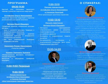 11:50-13:10 – лекция-практикум для хореографов и руководителей танцевальных коллективов.