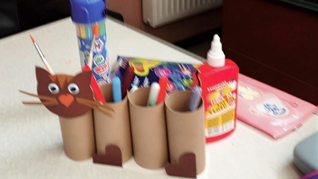 В пункте временного размещения дети создавали интересную поделку — подставку для карандашей, фломастеров и кисточек. Она выполнена в форме кошечки из втулок. Получилось не только красиво, но и полезно для хранения мелочей. Источник: Центральная городская библиотека имени Л.Н.Толстого