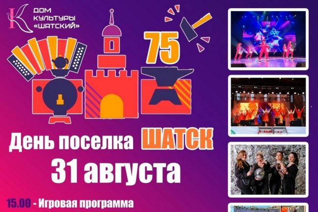 31 августа в 15.00 Шатск отметит свое 75-летие! В 15.00 на площадке перед домом культуры начинается ИГРОВАЯ ПРОГРАММА! В 16.00 – Детская ярмарка “Юный предприниматель”! Концертная программа детских вокальных коллективов! В 17.00 – Начинается работа торговых площадок, а также фотозона! Приходите на фотозону, делайте селфи и Вас ждет приятный сюрприз!…