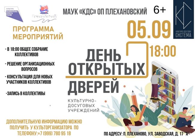 По традиции дом культуры поселка Плеханово распахнет свои двери в начале творческого сезона! Гости смогут познакомиться с творческими коллективами, принять участие в открытых уроках, задать любые вопросы руководителям и записаться в выбранное клубное формирование, чтобы в будущем году быть не только зрителем, но и активным участником наших мероприятий. Каждый сможет…