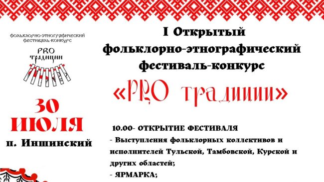 30 июля 2022 года на территории посёлка Иншинский состоялся I Открытый фольклорно-этнографический фестиваль-конкурс “PRO традиции” – мультиформатный фестиваль, направленный на сохранение традиций и популяризацию самобытного народного творчества. В торжественной церемонии открытия фестиваля приняли участие начальник управления культуры и туризма города Тулы Столярова Татьяна Николаевна, Заслуженный работник культуры Российской Федерации директор…