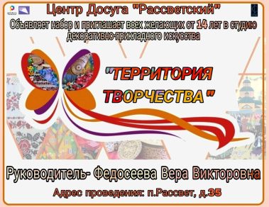С огромным удовольствием сообщаем Вам, что в нашем Центре Досуга “Рассветский” открывается студия декоративно-прикладного искусства “Территория Творчества”