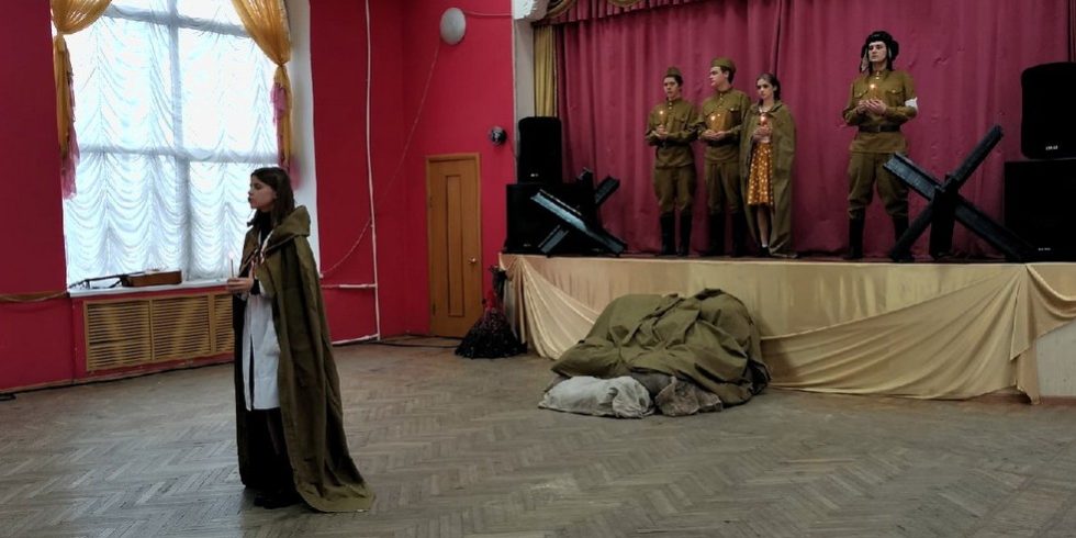 Для более эмоциональной подачи,наряду с документальными материалами, использованы стихи и песни о войне в исполнении юных артистов.