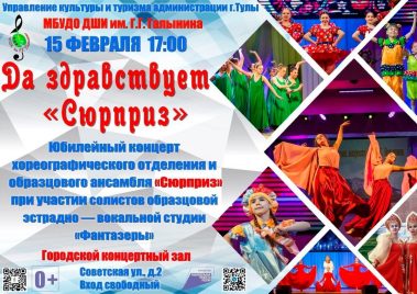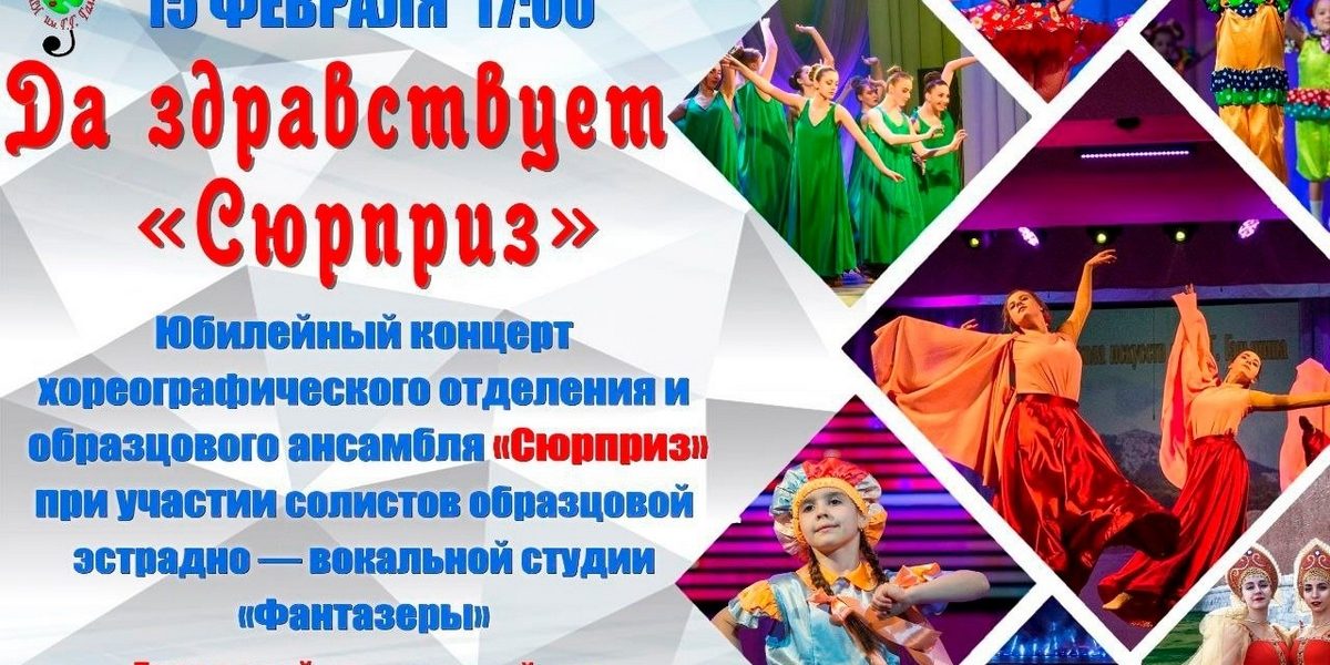 Приглашаем Вас посетить юбилейный концерт хореографического отделения и образцового ансамбля “Сюрприз” при участии солистов образцовой эстрадно-вокальной студии “Фантазёры” Детской школы искусств имени Г.Г. Галынина