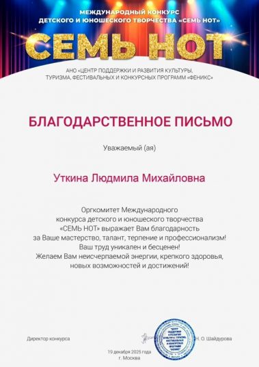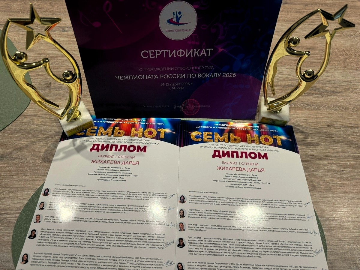 Даша получила сертификат на участие в финале «Чемпионата России по вокалу 2026», который состоится в марте и удостоена звания Лауреата I степени конкурса детского и юношеского творчества “Семь нот”.