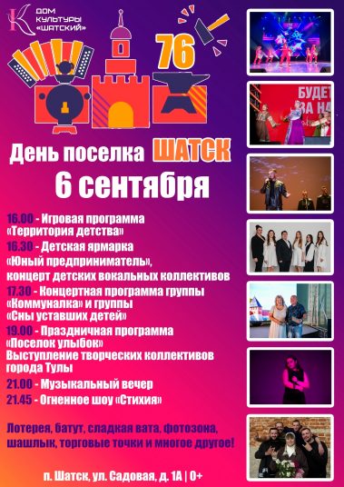 В 19.00 – Праздничная программа “Поселок улыбок”! В программе – вокальные и хореографические номера, а также – ЛОТЕРЕЯ! Выступление творческих коллективов города Тулы!
