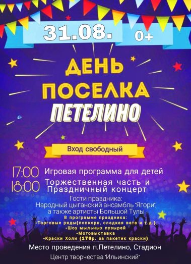 Уважаемые жители и гости , 31 августа приглашаем вас на мероприятия, посвящённые Дню посёлка Петелино! В этот день вы сможете стать участниками разнообразных развлечений для всей семьи.