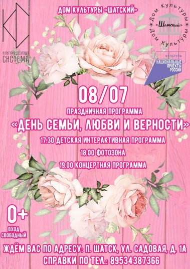 19.00 Праздничная программа, с концертными номерами от гостей города Тулы и поселка Шатск передаст преданность и верность своим родным и настоящую крепкую любовь.