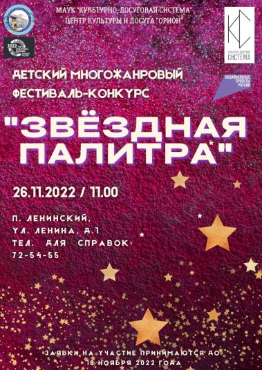 Центр культуры и досуга “Орион” встретит самых творческих и талантливых детей, которые будут радовать нас своими выступлениями в многожанровом конкурсе “Звёздная палитра”