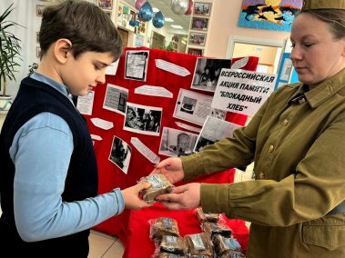 Завершился тематический час Всероссийской акцией памяти “Блокадный хлеб”. Кусочек хлеба весом в 125 грамм – символ сегодняшней акции. Именно такая ежедневная минимальная норма была установлена во время блокады Ленинграда. Это символ стойкости и мужества защитников города, их подвига на фоне всех тяжестей военного времени.