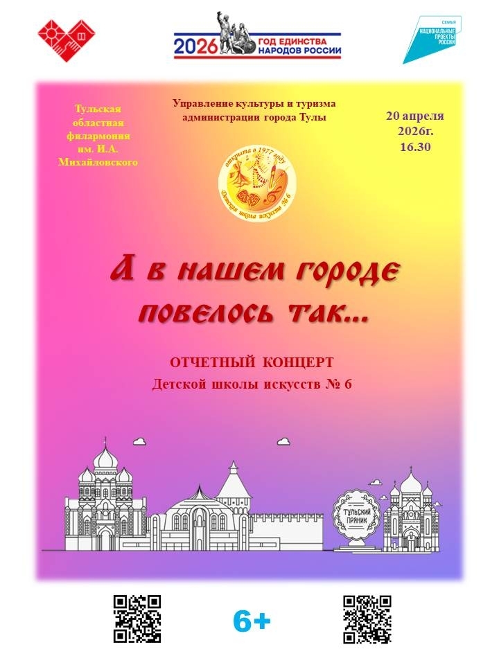 Приглашаем на Отчетный концерт солистов и творческих коллективов Детской школы искусств № 6, который состоится 20 апреля 2026 года в концертном зале тульской областной филармонии им. И.А. Михайловского (Тула, пр. Ленина, 51).