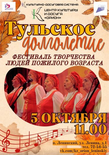 В честь этого замечательного праздника мы приглашаем всех желающих на фестиваль творчества людей пожилого возраста “ТУЛЬСКОЕ ДОЛГОЛЕТИЕ”, который состоится 5 ОКТЯБРЯ 2024 года в 11:00 в Центре культуры и досуга “Орион”.