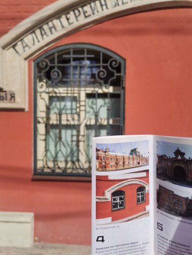 Один из объектов в путеводителе – вывески на торговых рядах на улице Советской, бывшей Посольской. Само здание рядов было построено в 1897 году, и до революции в каждой арке располагался отдельный магазин. В 2019 году во время реставрации торговых рядов под штукатуркой были обнаружены следы надписей — названия магазинов. Поскольку работы велись за счёт бюджета, проект и смета были составлены и утверждены заранее, то есть на реставрацию вывесок ресурсов уже не было. Тогда за дело взялся ТИАМ, организовав фандрайзинг, собрав необходимые средства, и с непосильной помощью волонтёров и восстановив старинные вывески.