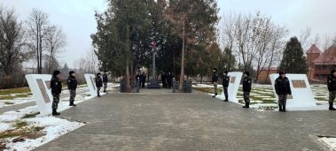 Салютная группа роты почетного караула произвела три залпа из стрелкового оружия в память о павших на полях сражений защитниках Отечества.