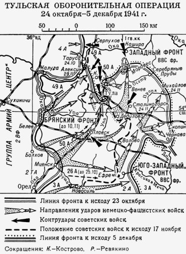 24 октября танки группы Гудериана, обходя открытые фланги частей 50-й армии, приблизились к Туле. Против них оборонялись 108-я танковая дивизия, кстати, не имевшая ни единого танка, 260-я стрелковая дивизия, 156-й полк войск НКВД, Тульский рабочий полк, батальон милиции и др. части.