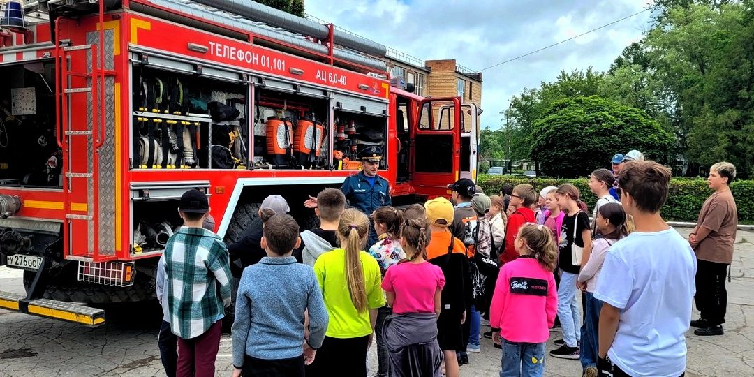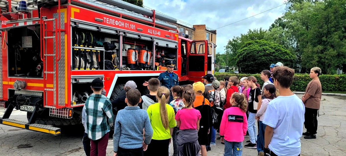 В КУЛЬТУРНО-ДОСУГОВОМ КОМПЛЕКСЕ в рамках проекта “Весёлые каникулы в клубе Детвора” начальник ПСЧ-52 ПСО ФПС ГПС Главного управления МЧС России по Тульской области капитан внутренней службы Мунич М.Г. со своей командой провели профилактическую беседу на тему “Противопожарная безопасность в летний период” с детьми пришкольного лагеря.