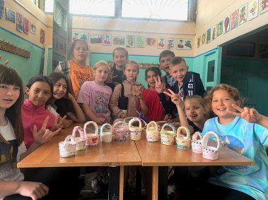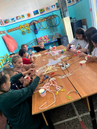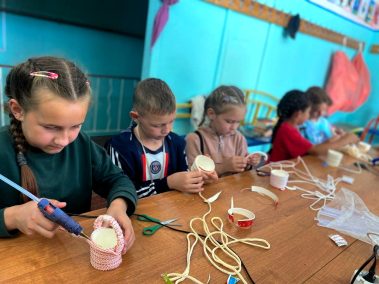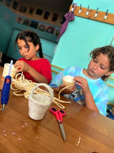 Нам понадобилась бельевая верёвка, стаканчики, клей пистолет, ножницы, украшения и корзиночка для мелочей готова.