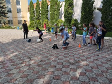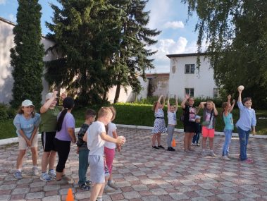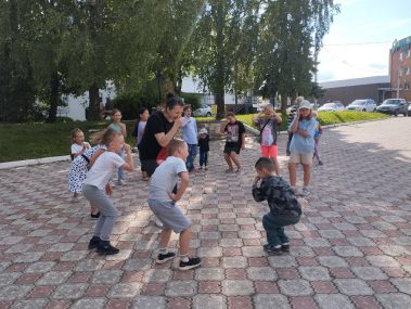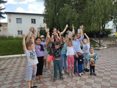 Размялись под песенку с ускорением, познакомились друг с другом и пошли… встретили избушку Бабы Яги и “полетали в ступе с метлой”.