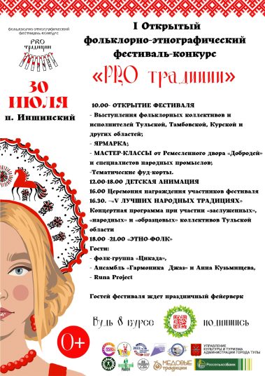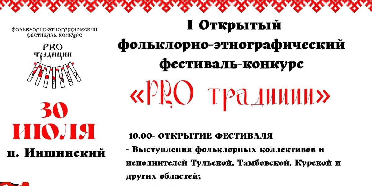 30 июля 2022 года на территории посёлка Иншинский состоится I Открытый фольклорно-этнографический фестиваль-конкурс “PRO традиции” – мультиформатный фестиваль, направленный на сохранение традиций и популяризацию самобытного народного творчества.