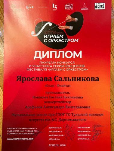 Сальникова Ярослава, учащаяся музыкальной школы Тульского колледжа искусств им. А.С. Даргомыжского (преподаватель Новикова Евгения Николаевна) прошла три отборочных конкурсных этапа конкурса-фестиваля “Играем с оркестром”, который проходит раз в два года в г. Москве.