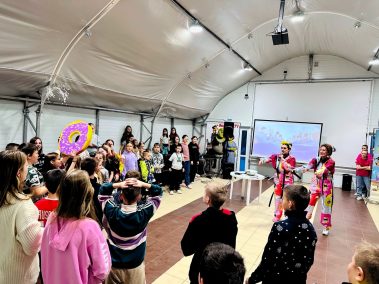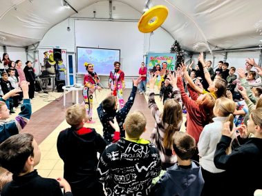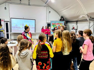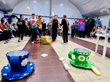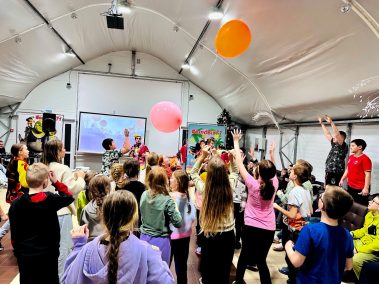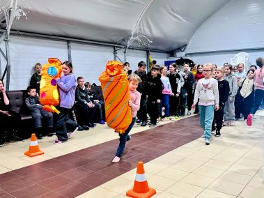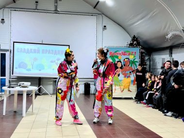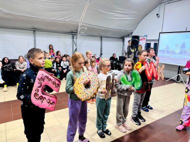 Ведущие – Пончик и Ириска вместе с ребятами участвовали в веселых эстафетах с мороженым, конфетками и огромным драже, играли в сахарок, отгадывали сладкие песни и собирали сладкие слова