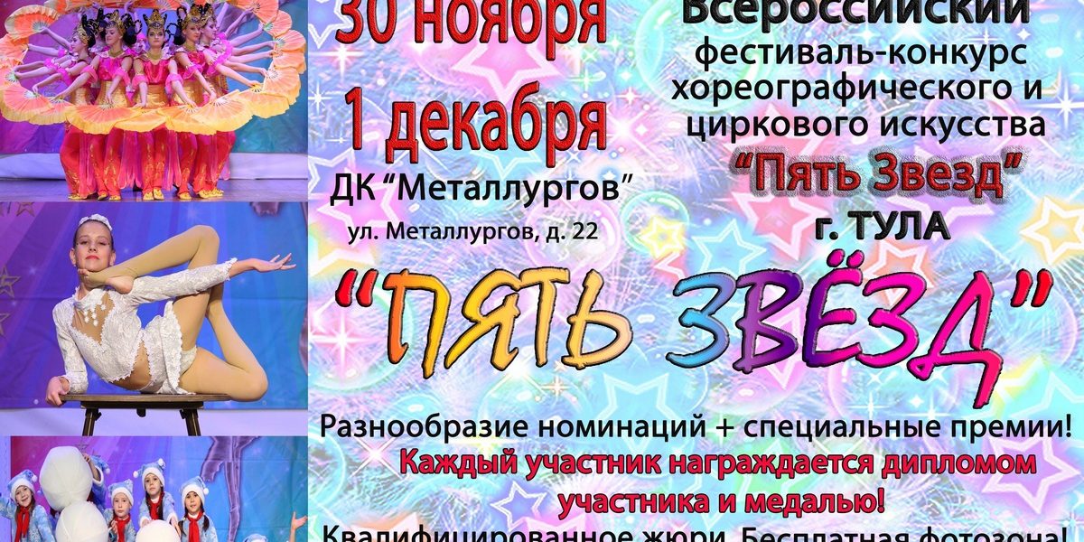ПРИГЛАШАЕМ ВАС И ВАШ КОЛЛЕКТИВ ПРИНЯТЬ УЧАСТИЕ В III ВСЕРОССИЙСКОМ ФЕСТИВАЛЕ-КОНКУРСЕ ХОРЕОГРАФИЧЕСКОГО И ЦИРКОВОГО ИСКУССТВА “ПЯТЬ ЗВЕЗД”, КОТОРЫЙ БУДЕТ ПРОХОДИТЬ 30 НОЯБРЯ И 1 ДЕКАБРЯ В ГОРОДЕ ТУЛА НА БАЗЕ ДК “МЕТАЛЛУРГОВ”